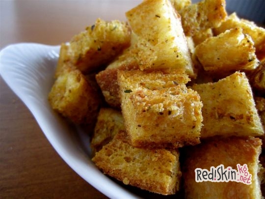 Эти сухарики лучше всего подходят для приготовления салатов (например, «Цезарь»), а также к первым блюдам. С белого хлеба удалите корочку и порежьте его на сантиметровые кубики. На маленьком огне разогрейте взятое в одинаковой пропорции сливочное и растительное масло. Когда масло начнет слегка «шипеть», в сковородку высыпьте в один слой крутоны и жарьте, все время помешивая, до хруста - около 10 минут. Затем выложите на бумажное полотенце, чтобы стекло масло.