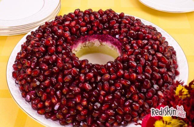 Салат «Гранатовый браслет» — оригинальное блюдо. Этот салат изумительно вкусный, аппетитный и к тому же он очень красив, ведь он изготавливается в виде браслета, да не простого браслета, а гранатового! Зерна граната салату придадут особый вкус! А еще, с помощью зерен граната салат обретает более естественный вид, что напоминает настоящий браслет с драгоценными камнями.
